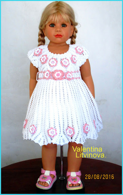 Платье связано крючком. Вязание начинать с кокеткиз. Кокетка круглая, связана по схеме №1.  Юбка связана узором "Козлики" переходящими в узор "Ананас. Пряжа 100% итальянский хдопок. Украшено красивым поясом и цветочками.